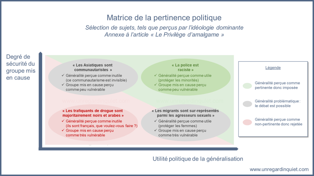 Il semble que la sélection des faits-divers significatifs et des généralités acceptables s’explique par la considération non de la vérité (pertinence statistique) mais de la pertinence politique : quel bien puis-je tirer de cette extrapolation et quel mal peut-il en sortir. Cette importance de la pertinence politique est d’ailleurs parfois mentionnée, lorsque le débat s’engage réellement : « quand bien même ce serait vrai, à quoi cela vous avance-t-il de le dire ? ». Notons que cette sorte de malhonnêteté intellectuelle se retrouve dans chaque famille politique et non seulement chez « les bien-pensants ». Ainsi, dès lors qu’une généralisation est proposée, la partie adverse ne répond souvent pas par des données statistiques mais dénonce une incitation à la haine : contre les musulmans, la police, les blancs, les noirs, les maghrébins, etc. Face à cela, le parti usant d’une généralité accuse l’autre de cacher un problème : la violence de l’islam, la violence de la police, le racisme des Européens de souche, le racisme anti-blanc, etc. Le débat ne porte jamais sur les chiffres.
